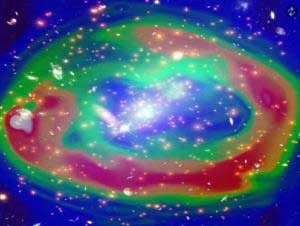 不过,有一个事实是确定无疑的:大自然已经将星系团转变成了一个强大的粒子加速器,其功能要比目前欧洲粒子物理研究所的巨大核强子碰撞器强大20倍。研究组成员斯蒂芬-帕尔塔尼说:“当然,与之相比,蛇夫座星系团要大得多,巨大核强子碰撞器的直径是27公里,而蛇夫座星系团的直径有200万光年。”目前世界上功能最强大的人造核粒子加速器位于欧洲粒子物理研究所在瑞士粒子物理实验室创建的“巨大核强子碰撞器”。正如恒星与行星起源于松散的尘埃和气体云团一样,星系也是起源于大得多的凝结块。当星系在空间移动时,自身巨大的引力将持续拖动环绕周围的尘埃及气体云。当它们发生碰撞或凝结成团时,产生的巨大能量将压缩和加热云团。